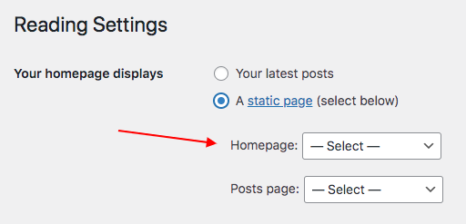 Next, click on the Homepage dropdown list and select the "Homepage" page you created as your static homepage.